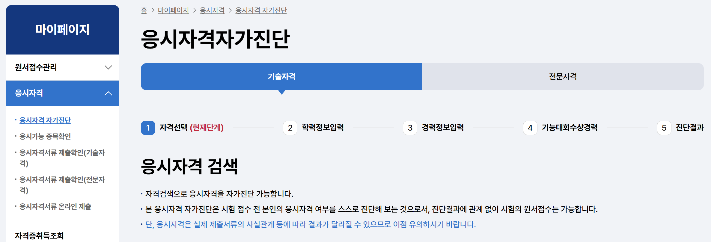 ‘마이페이지’로 가면 ‘응시자격 자가진단’ 메뉴가 있습니다.